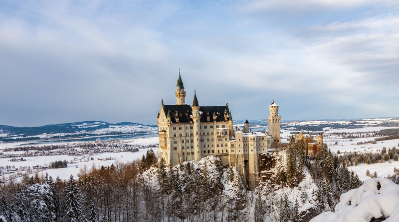 Il tuo viaggio può cominciare in Baviera, dove sorge il castello di Neuschwanstein. È probabilmente il più conosciuto, e quando lo vedi capisci subito il perché. Le torri bianche sembrano uscite da un sogno, sospese sopra i boschi dell’Algovia.